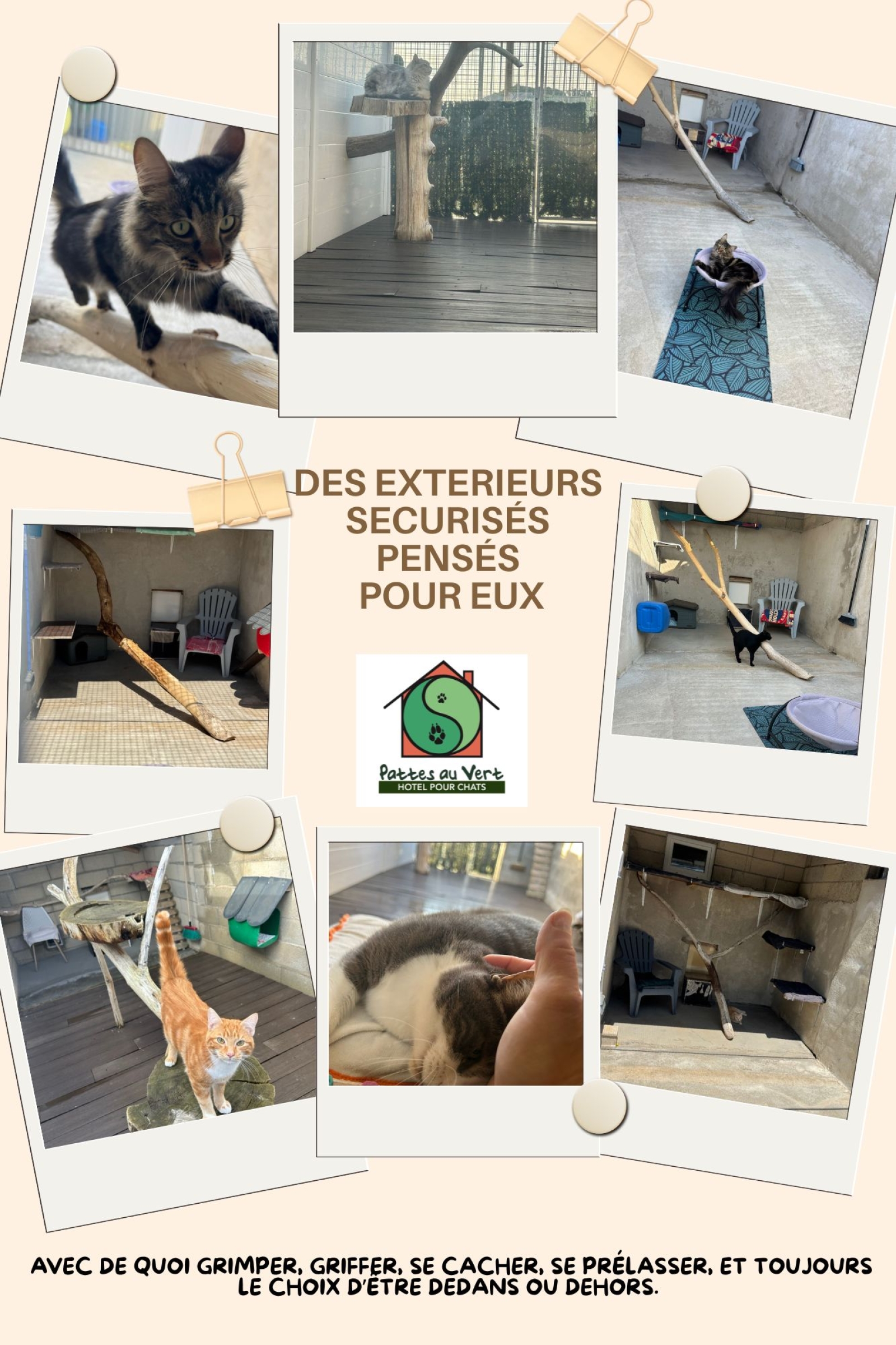 En Accès libre et permanent, chaque chat peut sortir à son rythme : prendre l'air, se prélasser au soleil, observer, grimper sur une vraie branche d'arbre ou faire ses griffes comme dans la nature.
